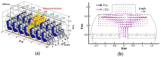(a) Measured section in the aircraft cabin, (b) Comparison of PIV experimental velocity data with the predicted velocity [].