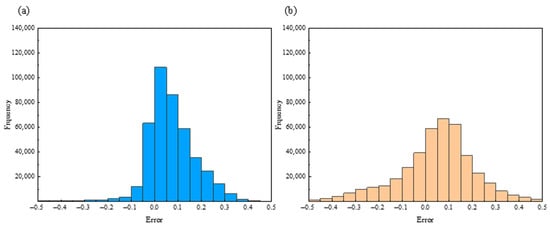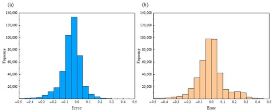 The relative errors of predicted air age using the two fast calculation methods are presented in Figure 6. It was observed that the distributions of the relative error approximate a normal distribution, with the majority of values concentrated within the range of −0.1 to 0.1, indicating that both methods provide good accuracy. As shown in Figure 6a, the error frequency of predicted air age based on the POD method decreases sharply as the relative error increases. And the distribution of the error frequency is asymmetrical, suggesting that the POD method is more prone to underpredicting the air age value. This may be attributed to the information loss during the downscaling process in the POD method. In contrast, Figure 6b shows a more symmetrical relative error distribution of the predicted air age from the ANN method.