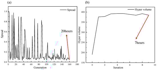 where  denotes the rectangle (or hyper-rectangle) in multidimensional space determined by the solution  and the reference point . The hypervolume is a measure of the total volume occupied by the solution set in the objective space, indicating the total volume covered by the solution set. When the hypervolume stabilizes, it suggests that the solution has converged in the solution space. The Pareto search algorithm achieves the optimal solution after 9 iterations (Figure 8b). Since the Pareto search is a non-dominated sorting algorithm, each solution found in successive iterations is at least as good as the previous one. As a result, fewer iterations are needed to reach the convergence. However, because the Pareto search method requires non-dominated sorting at each iteration, it takes more time per iteration. Despite taking longer per iteration, the Pareto search method was more efficient in terms of overall computational cost due to its fewer iterations. In terms of computational cost, the MOGA took 20 h to complete, while the Pareto search algorithm required only 7 h.