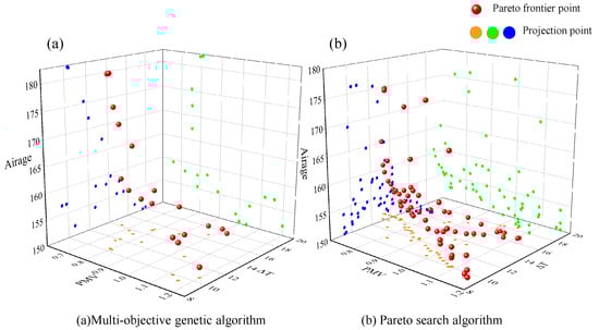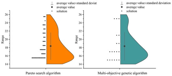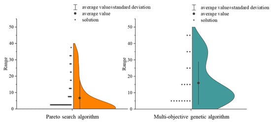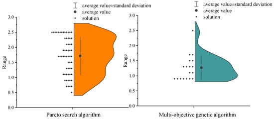 In this study, the MOGA and Pareto search methods were used for optimization. For the MOGA, the population size is 50, the crossover fraction is 0.8, the mutation probability is 0.01, and the number of elite counts in the population is 2. Due to the differences in their solution mechanisms, different iterative convergence criteria were applied. The “spread” index was used as the MOGA convergence criterion. The defining equation is given by Equation (19):