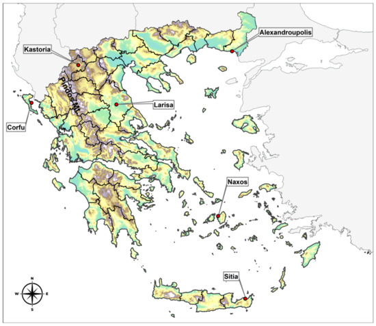 As previously mentioned, Greece is one of the most mountainous countries in Europe, with nearly 80% of its land covered with high mountains and hills [50]. In addition, the extensive coastline and thousands of islands and islets create a mosaic of climate patterns that require careful study and close observation in the context of climate change. For this work, six representative locations (Figure 1) were selected from the Greek region, each representing a distinct climate due to its proximity to the sea, elevation, and geographical orientation.