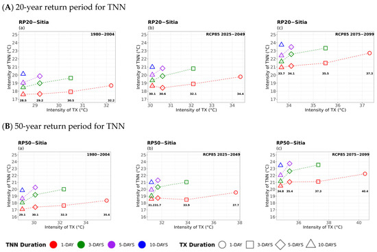 Multi-hazard results based on extreme values (x-axis) for four different durations (consecutive days) of TN, as 1 day (circle), 3 days (square), 5 days (rhombus), and 10 days (triangle) along with the extreme values (y-axis) of the four different durations (1 day in red, 3 days in green, 5 days in purple, and 10 days in blue colour) of 20- (top) and 50-year (bottom) periods for TXX for (a) historical, (b) near future, and (c) far future periods. The return levels of the examined return periods for each TN duration are marked inside figures in bold.