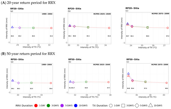Multi-hazard results based on extreme values (x-axis) for four different durations (consecutive days) of TX, as 1 day (circle), 3 days (square), 5 days (rhombus), and 10 days (triangle) along with the extreme values (y-axis) of the four different durations (1 day in red, 3 days in green, 5 days in purple, and 10 days in blue colour) of 20- (top) and 50-year (bottom) periods for RRX for (a) historical, (b) near future, and (c) far future periods. The return levels of the examined return periods for each TX duration are marked inside figures in bold.