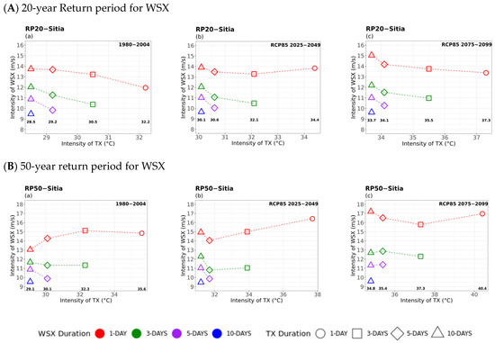 Multi-hazard results based on extreme values (x-axis) for four different durations (consecutive days) of TX, as 1 day (circle), 3 days (square), 5 days (rhombus), and 10 days (triangle) along with the extreme values (y-axis) of the four different durations (1 day in red, 3 days in green, 5 days in purple, and 10 days in blue colour) of 20- (top) and 50-year (bottom) periods for WSX for (a) historical, (b) near future, and (c) far future periods. The return levels of the examined return periods for each TX duration are marked inside figures in bold.