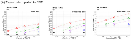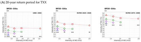 In the following subsections, the results of the applied methodology are discussed for the 20-year and 50-year return periods during the historical, near-, and far-future periods under RCP8.5, according to the primary hazard (i.e., TX, TN, RR, and WS). Due to space limitations, only the case study of Sitia (see Figure 1 for location) is illustrated in the main text. This region has intense local-scale weather patterns due to highly complex topography and air–sea interaction with rapidly changing climate extreme characteristics (e.g., heatwaves and heavy thunderstorms). The Supplementary Material (SM) contains the figures for the remaining locations (e.g., Alexandroupolis, Kastoria, Larissa, Naxos, and Corfu). The main article also discusses some interesting results concerning the other locations shown in Appendix A.