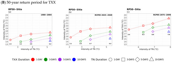 In general, similar patterns are seen between the corresponding periods in the 20- and 50-year return levels of TNN versus TX. Events of longer duration of TX were found to be associated with lower TNN return values that lasted a shorter time (e.g., 1 day and red curves). The impact of climate change on extreme hot events compounded with extreme minimum temperatures was evidenced by the increasing TX and TNN return levels for all durations, particularly in the 50-year return period and in the far future. The most important increases in TX and TNN return levels were seen in inland locations like Larissa (central mainland) and Kastoria (northern part of Greece), particularly in the far-future period. Overall, those results indicated a prolonged duration of tropical nights, which increases further in the far future, as TNN yielded values above 20 °C in all locations except for Kastoria (northern mountainous area), (Figure A1). For instance, in the case of Sitia, where 5-day and 10-day durations with TX values above 30 °C and 5-day and 10-day durations of TNN values above 20 °C were found in the near future, while both intensity values were seen to sharply increase in the far future. The increase in tropical nights and hot days is consistent with the findings of Politi et al. (2022) [14] who analysed the same datasets and found that, under RCP8.5, there was a notable increase in more than 40 days for both future periods throughout the entire country. Moreover, Founda et al. (2019 [56]) found an increase in hot extreme seasons by two months in terms of tropical nights for 2071–2100 under RCP8.5.