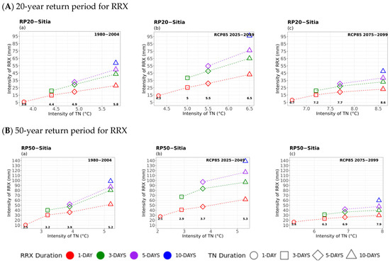 Considering precipitation as a secondary hazard (Figure 7), noticeable amounts of RRX were estimated to increase with TN duration in the historical period, particularly for TN events of 5- and 10-day durations. Also, higher RRX intensities were observed in the near future. Overall, the 5- and 10-day durations indicate that more intense and longer extreme rainy events may occur in the near future, accompanied by cold events. The increase in precipitation was also justified by the findings in the study by Politi et al. (2022) [14], where a positive change signal was observed in certain areas of the western parts of the mainland, the Ionian Islands (e.g., in Corfu), and parts of Crete in the near future. On the other hand, the results in the far future showed that RRX would decrease significantly, so that fewer cold and rainy extremes are likely to occur compared to the historical and near future periods. Similar patterns were found regarding the 50-year return period, but with higher values of RRX, compared to the 20-year return period, particularly in the historical and near-future periods. In general, the results of all case studies indicated that precipitation intensity is not expected to differ among different RRX durations, particularly when considering the 3- and 5-day RRX durations (green and purple colours) between the historical and future periods. However, the locations of Sitia and Naxos, representing the central and southern Aegean Sea, would be impacted by more intense and extended extreme rainfall–cold events.