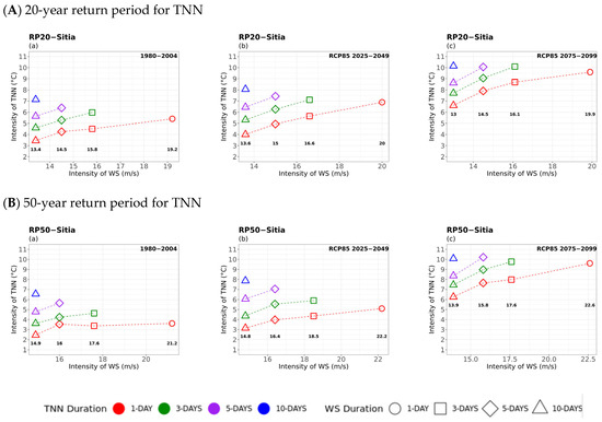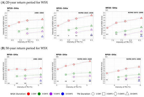 Multi-hazard results based on extreme values (x-axis) for four different durations (consecutive days) of TN, as 1 day (circle), 3 days (square), 5 days (rhombus), and 10 days (triangle) along with the extreme values (y-axis) of the four different durations (1 day in red, 3 days in green, 5 days in purple, and 10 days in blue colour) of 20- (top) and 50-year (bottom) periods for WSX for (a) historical, (b) near future, and (c) far future periods. The return levels of the examined return periods for each TN duration are marked inside the figures in bold.