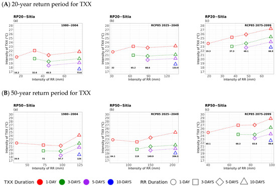 Multi-hazard results based on extreme values (x-axis) for four different durations (consecutive days) of RR, as 1 day (circle), 3 days (square), 5 days (rhombus), and 10 days (triangle) along with the extreme values (y-axis) of the four different durations (1 day in red, 3 days in green, 5 days in purple, and 10 days in blue colour) of 20- (top) and 50-year (bottom) periods for TXX for (a) historical, (b) near future, and (c) far future periods. The return levels of the examined return periods for each RR duration are marked inside the figures in bold.
