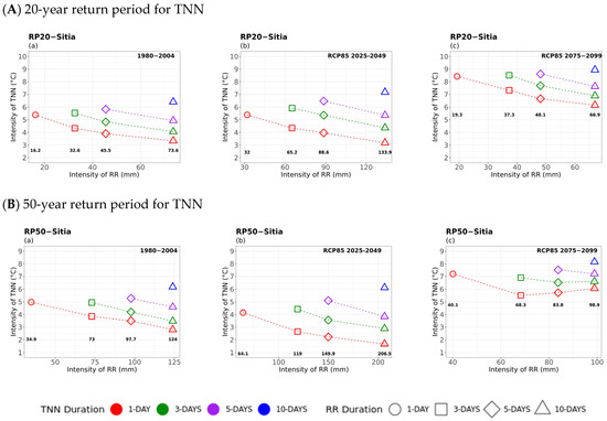 Figure 10 shows the RR 20- and 50-year period results with TNN considered as a secondary hazard. In general, similar patterns of curves are observed between the 20- and 50-year return levels and the respective historical and future periods with comparable values in minimum temperatures. In general, for a given TNN time window (same colour curve), TNN values were found to decrease for an increasing RR duration. Thus, rainfall events of longer duration were found to be associated with lower minimum temperatures for all periods studied. Furthermore, the analysis for far-future events yielded significantly higher extreme minimum temperatures compounded with reduced precipitation for all rainfall durations compared to the historical and near-future periods. Such an outcome reveals the tendency for milder extreme minimum temperatures associated with lower rainfall amounts. That was also deduced for all locations studied, including the mountainous northern areas (Figure A3), where the extreme cold-wet compound events are more likely to occur [13,62]. The results highlight the impact of climate change across all geographic locations in the far future on this kind of compounded event characterised by milder extreme minimum temperatures and reduced precipitation.