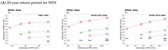 The investigation of rainy windstorms (Figure 11) showed that, for a given extreme wind duration, the 20- and 50-year WSX return levels increased notably with increasing rainfall intensity and duration in all periods studied. Events with a given rainfall intensity and duration were found to have extreme winds that became weaker as their duration increased. It was also deduced that the WSX return values decreased as their duration increased; hence, the strongest winds appeared to last for shorter periods (1 day) during extreme precipitation events in all periods. While a trend of increasing extreme winds during extreme precipitation events of a given duration was found from the historical to the near-future, the return values of extreme winds and rainfall significantly seemed to decrease in the far future.