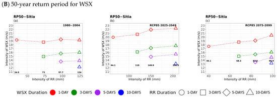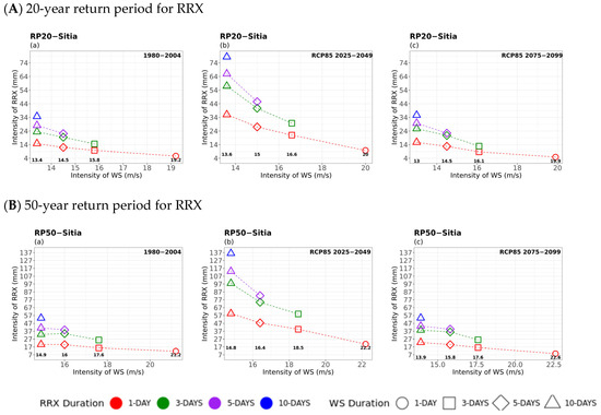 Multi-hazard results based on extreme values (x-axis) for four different durations (consecutive days) of RR, as 1 day (circle), 3 days (square), 5 days (rhombus), and 10 days (triangle) along with the extreme values (y-axis) of the four different durations (1 day in red, 3 days in green, 5 days in purple, and 10 days in blue colour) of 20- (top) and 50-year (bottom) periods for WSX for (a) historical, (b) near future, and (c) far future periods. The return levels of the examined return periods for each RR duration are marked inside figures in bold.