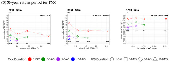 The multi-hazard analysis was concluded with the investigation of the 20- and 50-year return levels of extreme winds of different durations compounded with the secondary hazards of TXX, TNN, and RRX as shown in Figure 12, Figure 13 and Figure 14, respectively, for the case of Sitia.