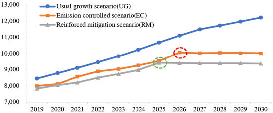 In this scenario, the influencing factors change as A + B2 + C2 + D + E2, which are industrial structure optimization adjustment and increase in internal structure adjustment changes in the manufacturing industry. Based on the decline rate of manufacturing industry from 2015 to 2018 and combined with the development of the entire city’s industries, three five-year planning periods are set for the reduction rate of energy consumption per unit of industrial added value, and efforts are being made to accelerate the reduction rate of energy consumption in industries such as chemical engineering and black metal smelting. Large gas power projects and new energy projects are being accelerated and put into operation ahead of schedule. New photovoltaic and wind power projects will be added during the 14th and 15th Five Year Plans, and more effective energy-saving and emission reduction policies will be implemented. The electricity and thermal consumption of industrial enterprises is predicted based on the actual changes in the city, regardless of the scenario. The result is that in the RM scenario, carbon emissions from the industrial sector will peak in 2025, with a total carbon emission of 94.22 million tCO2, which is 22.9% less than the UD scenario, as shown in the red circle in Figure 2.