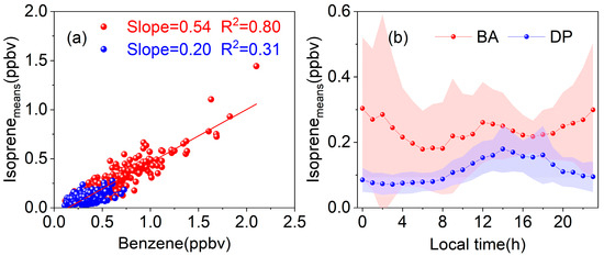 (a) Correlation between isoprene and benzene observed at night; (b) Daily variation characteristics of isoprene observations at BA and DP sites.