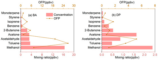 Concentrations of measured VOCs and calculated daytime ozone formation potential (OFP) at (a) BA and (b) DP.