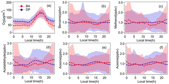 Diurnal variation characteristics of observed O3 and normalized VOCs (a–f).