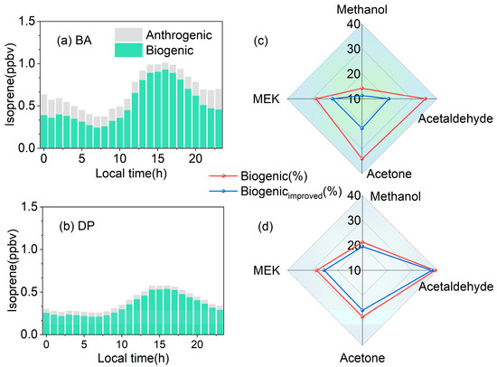 (a) and (b): Diurnal variation in anthropogenic and biogenic sources of BA and DP isoprene; (c) and (d): Comparison of biogenic sources of OVOCs before and after improvement at BA and DP sites.