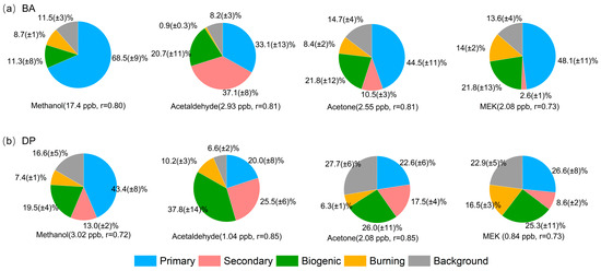 Source apportionment results for four OVOCs at urban and suburban sites. (a) BA and (b) DP.