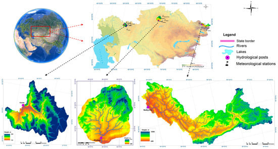 This study examined the catchment basins of three rivers: the Ulken Kobda river—Kobda village, the Zhabay river—Atbasar city, and the Buktyrma river—Lesnaya Pristan village (Figure 1).