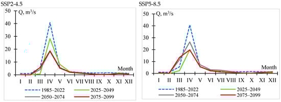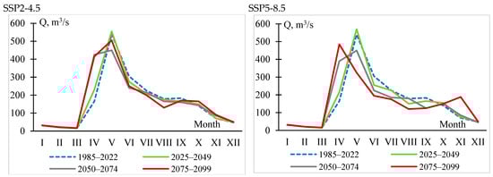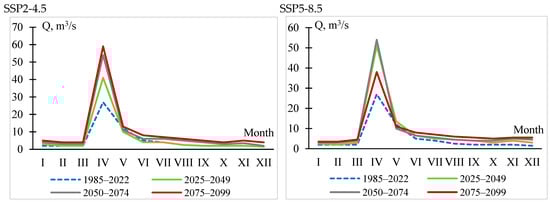 According to averaged data from global models under the scenarios of greenhouse gas concentrations SSP2-4.5 and SSP5-8.5, the forecast values of water runoff for the studied water bodies were modelled. These climate models satisfactorily describe the current temperature and precipitation regime in the study regions []. In accordance with the recommendations of the World Meteorological Organisation (WMO), 25–30-year periods (climatic ‘norms’) are used as the international standard for calculating the average annual values for temperature, precipitation and other meteorological indicators [,]. This ensures the comparability of results from different studies and regions, and provides an objective basis for assessing the degree of deviation of current weather conditions from typical conditions. Figure 2, Figure 3 and Figure 4 show representative seasonal dynamics of river flow over the last 40 years (from 1985 to the present) and for three periods (2025–2049, 2050–2074, 2075–2099). The analysis based on these intervals allows for the identification of stable climate trends and provides a scientifically sound basis for climate and water resource management planning.