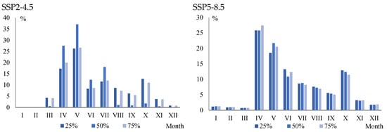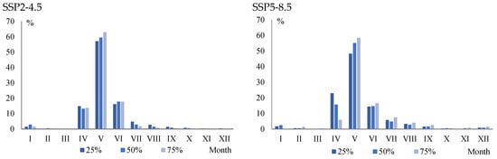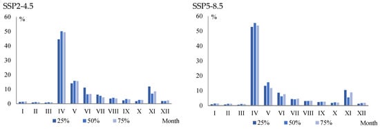 According to scenario SSP5-8.5, in high-water years, spring accounts for 48.3% of the annual runoff, which is 8.8% lower than in the SSP2-4.5 scenario. Summer runoff decreases to 14.4% and autumn runoff to 5.8%. Winter increases significantly, reaching 23%.