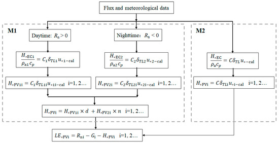 Method 1 (M1): First, all half-hourly data were divided into daytime (net radiation (Rn) > 0) and nighttime groups (Rn < 0), and the mean values were calculated. Second, constants C1 and C2 were determined from the linear relationship between the half-daily mean standard deviation of low-frequency temperature, friction velocity, and the sensible heat flux observed by the EC system (and corrected for energy balance closure; see Section 2.4) for daytime and nighttime, respectively.