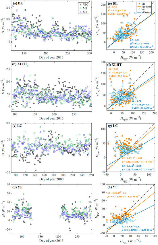 Comparisons of daily sensible heat flux measured by the EC system (H∗EC) and calculated by two daily-scale FV methods (HFV). (a–d) Time series for DL, XLHT, LC, and YF sites, (e–h) 1:1 plot for DL, XLHT, LC, and YF sites. The k with the intercept forced to zero, R2, the statistically significant value, and RMSE are provided.