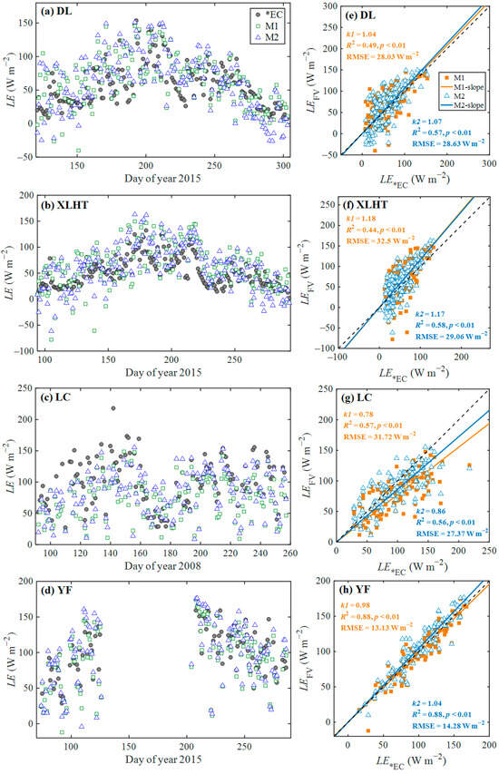 Comparisons of daily latent heat flux measured by the EC system (LE∗EC) and calculated by two daily-scale FV methods (LEFV). (a–d) Time series for DL, XLHT, LC, and YF sites, (e–h) 1:1 plot for DL, XLHT, LC, and YF sites. The k with the intercept forced to zero, R2, the statistically significant value, and RMSE are provided.