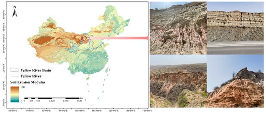 The Pisha sandstone used in this experiment was collected from a severely eroded area in the Inner Mongolia section of the Yellow River Basin (as shown in Figure 1). This region exhibits some of the most representative topographical and geomorphological features associated with soil erosion, characterized by high surface fragmentation. It serves as a major sediment source for the Yellow River. Due to long-term severe soil and water loss, the area has posed significant threats to the ecological security of the middle and lower reaches of the Yellow River. Therefore, it holds substantial research value for understanding erosion processes and informing soil conservation strategies.
