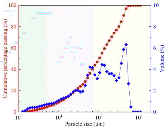 A representative red Pisha sandstone from the region was selected as the experimental material. This type of sandy mudstone is characterized by low diagenetic consolidation and weak interparticle cementation. Upon contact with water, it disintegrates into slurry due to its distinctive structural properties, making it highly susceptible to soil and water loss under rainfall conditions. During field sampling, surface debris such as fallen leaves and grass roots was first removed from the sampling sites. Subsequently, surface Pisha sandstone samples were collected from a depth of 0–20.0 cm. The collected samples were air-dried under natural conditions in the laboratory, then crushed using a grinding device and sieved through a 5.0 mm standard mesh. Plant roots, gravel, and other impurities were carefully removed to obtain clean material suitable for experimentation. The particle size distribution of the experimental material was determined using a Malvern Mastersizer 3000 laser diffraction particle size analyzer, as shown in Figure 2.