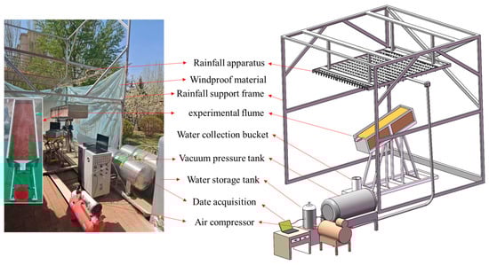An artificial runoff scouring method was employed to systematically quantify rill erosion states on hillslopes under controlled laboratory-scale conditions. The experimental setup primarily consisted of a self-developed Pisha sandstone rainfall–erosion apparatus, a water supply and stabilization system, and a data acquisition system (Figure 3). To provide a clearer representation of the setup, Figure 3 combines an actual photograph of the laboratory apparatus (left) with its corresponding schematic diagram (right). The rainfall simulator was constructed on a modular steel frame with an intelligent control unit [46]. A rainfall platform was installed at adjustable heights and equipped with a matrix of 198 atomizing nozzles (18 × 11), in combination with a pressure-stabilizing device, to ensure that raindrop size and terminal velocity closely resembled natural rainfall. The rainfall sprinkler system is adjustable within a height range of 3–5 m, and in the present experiment it was set to 5 m. Rainfall uniformity was continuously monitored by distributed electronic rain sensors embedded in the frame in a grid layout, with calibration performed using standard rain gauges prior to each experiment. Data were corrected by an automated algorithm and fed back to the control panel for dynamic adjustment. The water supply system adopted a dual redundant design with a compressor feeding both a storage tank and a vacuum stabilizing tank to maintain stable pressure, while deionized water was used throughout all experiments to avoid chemical interference. During experiments, windproof materials and damping devices were used to minimize environmental disturbance.