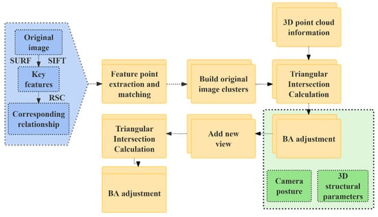 As illustrated in Figure 4, key features are first identified within the image, and correspondences are established through feature point extraction and matching. Subsequently, the matched feature points are employed to construct original image pairs, and triangulation-based intersection calculations are conducted to recover 3D point cloud information. Based on these results, bundle adjustment (BA) is applied to optimize camera poses and refine 3D structural parameters. Following optimization, additional views are incorporated to further enrich the 3D reconstruction dataset [51]. For each additional view, triangulation calculations and bundle adjustment are repeated to progressively enhance reconstruction accuracy and stability [52]. During feature extraction, scale-invariant feature transform (SIFT) and speeded-up robust features (SURFs) are primarily employed to extract key feature points from images and match them across views. Subsequently, the fundamental matrix between two views is estimated using the random sample consensus (RSC) method and solved iteratively using the 8-point algorithm. Given the matching points (xi, yi) and (x′i, y′i) in the two images, the basis matrix F needs to satisfy Equation (6).