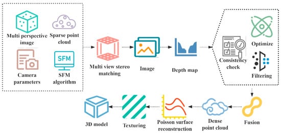 In Figure 5, first, the multi-view image and the sparse point cloud generated by the SFM algorithm and the camera parameters are input. Second, independent depth maps are generated for each image by MVS matching. Next, the depth maps are optimized and filtered using geometric consistency test. Then, a dense point cloud is generated by depth map fusion. Finally, Poisson surface reconstruction and texture mapping are performed on the dense point cloud to generate a high-precision 3D model. The Poisson equation computational expression is shown in Equation (9).