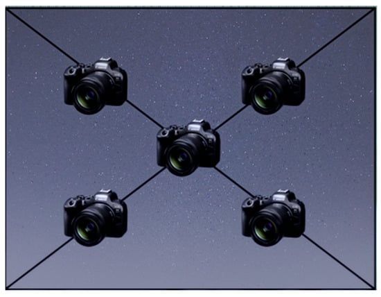 As illustrated in Figure 6, the image acquisition system within the experimental area was deployed using a spatially optimized configuration scheme. Digital cameras were placed at the 20% and 80% positions along each of the two main diagonals of the study area, with an additional camera positioned at the intersection of the diagonals’ geometric centers. To ensure complete coverage, cameras at the four corners were mounted with a calibrated inward tilt. The tilt angle was precisely maintained within 5° ± 0.5°, whereas the central camera was oriented vertically downward, forming a 90° angle with the ground. This spatially symmetrical layout not only eliminates blind spots within the monitoring area, but also minimizes image distortion, thereby providing high-quality input for subsequent data analysis.