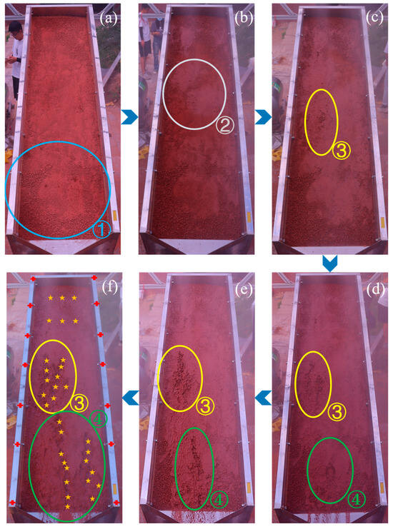 Figure 8 illustrates the erosion states of the experimental slope at different time intervals under a flow rate of 2 L/min and a slope of 15°. As shown in the figure, the erosion process of the Pisha sandstone slope can be broadly divided into four stages: infiltration and particle rolling, splash and sheet erosion, initial rill incision, and mature rill networks, highlighting the dynamic and stage-dependent nature of Pisha sandstone erosion under simulated rainfall conditions. At the initial stage (Figure 8a), surface infiltration occurred rapidly after rainfall onset, causing slight surface subsidence. Under gravity and slope effects, larger particles began migrating downslope, often aggregating into clumps and rolling downward (➀). Precipitation mainly acted through localized infiltration and splash, dislodging fine particles from the weakly cemented Pisha sandstone. Given the low porosity and poor permeability of Pisha sandstone, the initial kinetic energy of raindrops falling on the dry surface dislodged and splashed fine particles. In the early splash erosion stage (Figure 8b), continued rainfall filled microcracks and pores, producing a thin muddy film. Raindrop impact on the gradually wetted surface generated widespread splash and shallow sheet flow. Fine particles were detached more easily due to the argillite’s bedding and fracture structure. At this stage, overland flow remained weak but sufficient to entrain dispersed sediment (➁). As rainfall progressed into the incipient rill stage (Figure 8c), thin overland flow converged downslope, increasing runoff velocity and shear stress. Local weaknesses in the soil matrix, together with small surface undulations, promoted the formation of tiny scouring pits and drop structures. These pits deepened under vortex flow, eventually connecting into discontinuous rill traces, particularly in the mid-slope zone where runoff convergence was strongest (➂ and ➃). Finally, in the mature rill development stage (Figure 8d–f), the erosive force intensified and initial rill channels expanded both longitudinally and laterally. Branching and merging occurred, forming a more integrated rill network in the lower slope section. Local variations in rock resistance and soil clod disintegration controlled the heterogeneity of rill density and width. This stage marked the transition from sheet erosion to a well-developed rill erosion pattern, with sediment transport dominated by concentrated flow rather than dispersed splash. Rill development was most pronounced in the middle and lower sections of the test flume.