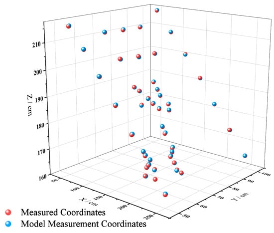 As shown in Figure 9, red spheres represent total station measurements, while blue spheres denote the corresponding coordinates reconstructed by the SFM-MVS system. The overall distribution demonstrates that the measured and reconstructed points exhibit a high degree of spatial coincidence across both the slope surface and the flume structure. The 3D reconstruction model achieved excellent accuracy, with a horizontal (planar) error of only 3.1 mm and a vertical (elevation) error of 3.7 mm. The close alignment of red and blue points across an elevation range of 160–210 cm confirms the ability of the system to generate dense point clouds with millimeter-level precision and stability. Although minor local deviations are observed, they remain within the tolerance range of image-matching and point-cloud reconstruction processes. These results demonstrate that the proposed SFM-MVS–based multi-view stereo matching system not only maintains high reconstruction accuracy under heterogeneous surface conditions but also effectively captures subtle morphological changes during the rill erosion process, providing reliable technical support for dynamic monitoring and quantitative analysis of slope erosion.