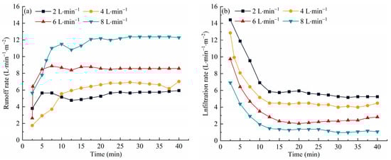Under different flow rate conditions (2 L/min, 4 L/min, 6 L/min, and 8 L/min), the development characteristics of rill erosion morphology on sandy loam slopes were quantitatively analyzed in a continuous manner using the SFM-MVS system. Data were collected at 2.5 min intervals throughout the experiment. The temporal variations in runoff yield rate and infiltration rate under each flow condition are presented in Figure 10.