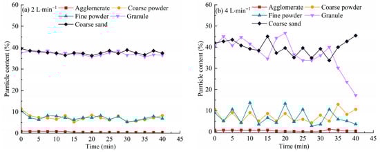Figure 10a,b illustrate the temporal variations in runoff yield rate and infiltration rate, respectively, under different flow rate conditions. As shown in Figure 10, with increasing flow rate, the runoff yield rate of the experimental soil rises significantly. Under flow rates of 2 L/min, 4 L/min, 6 L/min, and 8 L/min, the runoff yield rates increased by 28.7%, 49.3%, 62.7%, and 78.8%, respectively, during the first 30 min of the experiment. The increase was especially pronounced under high-flow conditions (6 L/min and 8 L/min), indicating that as inflow increases, surface runoff on the slope accelerates and the water-holding capacity of the sandy loam soil tends toward saturation. In contrast, the infiltration rate exhibited an inverse trend. At the beginning of the experiment, infiltration rates were highest, with initial values of 14.8 mm/h, 12.9 mm/h, 9.5 mm/h, and 7.3 mm/h under flow rates of 2 L/min, 4 L/min, 6 L/min, and 8 L/min, respectively. These values dropped rapidly and stabilized between 10 and 15 min, maintaining average rates of approximately 6.2 mm/h, 5.3 mm/h, 3.8 mm/h, and 1.9 mm/h, respectively. During the middle and later stages of the experiment, infiltration rates remained relatively stable or exhibited minor fluctuations, suggesting that the infiltration capacity of sandy loam is strongly influenced by soil saturation. Under higher flow conditions, the soil quickly reached a stable infiltration stage, whereas lower flow rates resulted in a more prolonged infiltration process. The temporal variation in sediment particle size distribution under different flow rate conditions is shown in Figure 11.