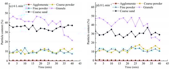 Time course of grain size distribution of eroded sediment under different flow conditions ((a) 2 L/min, (b) 4 L/min, (c) 6 L/min, (d) 8 L/min).