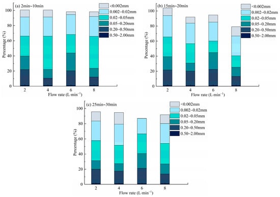 As shown in Figure 13a, the proportion of fine particles (<0.02 mm) exhibited a distinct stage-dependent decline with increasing erosion duration. At the early stage of erosion, low flow rates (2 L/min) preserved the highest fraction of fine particles, exceeding 20%, which reflects the preferential detachment and mobilization of surface fines under weaker hydraulic forces. In contrast, high flow rates (6–8 L/min) at the same stage already showed markedly reduced fine fractions (<12%), indicating that intense runoff rapidly entrains and transports fine sediment out of the slope system. During the middle stage, the differences among flow conditions became less pronounced, as fine particles were progressively depleted across the surface. By the late stage, fine-particle content consistently decreased across all flow intensities, converging to relatively low values. This systematic reduction highlights the selective depletion of fines over time, signifying a gradual shift in sediment composition from fine-dominated to coarse-dominated material.
