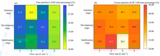 Changes in particle-size fractions under different erosion stages and flow rates. (a) Fine particle fractions (<0.02 mm); (b) coarse particle fractions (0.20–2.00 mm).