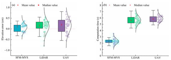 To rigorously assess the accuracy and stability of the proposed SFM-MVS system, we conducted a comparative analysis under the experimental conditions described in Section 3.1. Two widely used reference methods—light detection and ranging (LiDAR) and unmanned aerial vehicle (UAV) photogrammetry—were selected as benchmarks. Stability and computational efficiency served as the primary evaluation criteria, with the results summarized in Figure 14.