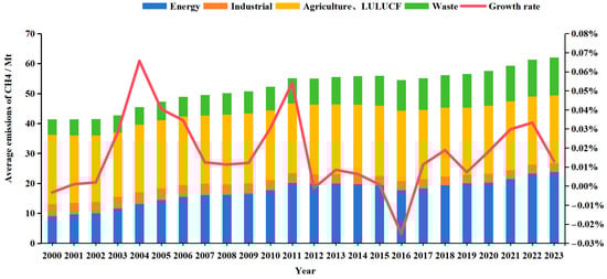 China’s CH4 emissions exhibited an overall fluctuating upward trend from 2000 to 2023, with distinct phase-specific variations. Rapid Growth Phase (2000–2010): CH4 emissions increased at an average annual rate of 2.1%, exceeding 50 Mt for the first time in 2008. This surge was primarily driven by rapid growth in emissions from the energy sector and waste management sector. Slowdown Phase (2011–2016): The growth rate declined to 1.4% per year, with emissions stabilizing around 55.12 Mt. During this period, emissions from the energy and agricultural sectors plateaued, while growth in the waste sector decelerated. Resurgence Phase (2017–2023): The annual growth rate rebounded to 1.9%, reaching a historic peak of 62.15 Mt in 2023. This resurgence was mainly attributed to a sharp rebound in energy sector emissions, continued growth in waste-related emissions, and an incremental rise in agricultural sector emissions. Notably, emissions from the industrial processes sector remained relatively stable throughout the study period (Figure 1). The observed phase-specific variations in CH4 emissions were closely linked to China’s economic development cycles, energy structure optimization policies, and improvements in waste management systems.