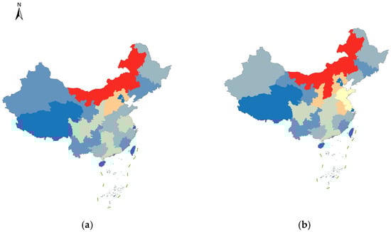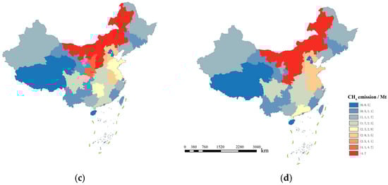 The spatial analysis of China’s provincial CH4 emissions revealed distinct geographical patterns across 2000 (Figure 2a), 2010 (Figure 2b), 2020 (Figure 2c), and 2023 (Figure 2d). The 31 provinces exhibited pronounced regional disparities, with emissions generally following an east-high, west-low gradient that gradually expanded northwestward over time. Energy-intensive provinces, including Shanxi, Inner Mongolia, and Shaanxi, consistently maintained the highest emission levels, reaching 8.07 Mt, 7.07 Mt, and 4.71 Mt, respectively, by 2023. Secondary emission hotspots emerged in Anhui, Shandong, and Hebei provinces, where emissions ranged between 3 and 3.5 Mt in 2023, whereas the lowest emission values (<0.3 Mt) persisted in southern and western regions, such as Hainan, Qinghai, and Tibet. This spatial distribution reflects the complex interplay between regional energy production activities, varying economic development patterns, and differential implementation of emission control policies across provinces. The observed northwestward shift in emission hotspots corresponds with the relocation of energy extraction activities, establishment of new industrial bases, and evolving regional environmental regulations, collectively shaping China’s dynamic CH4 emission landscape over the study period.