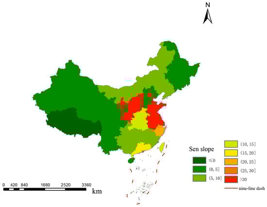 This study utilized the Theil–Sen slope method to examine the spatial trends of CH4 emissions in China from 2000 to 2023 [24]. The calculation formula for the Sen slope is as follows: