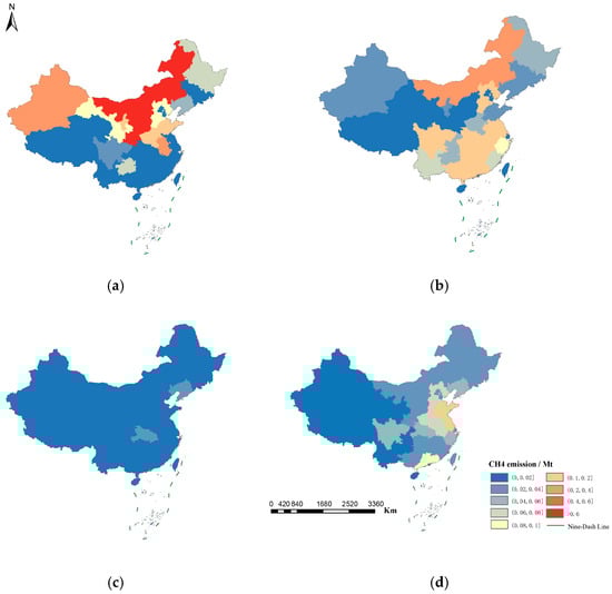 Based on the IPCC 2006 sectoral classification [22], an analysis of the spatial distribution characteristics of CH4 emissions across China’s energy (Figure 5a), agriculture (Figure 5b), industry (Figure 5c), and waste (Figure 5d) sectors in 2023 revealed distinct patterns. In the energy sector, emissions are predominantly concentrated in coal-rich regions, such as Inner Mongolia, Shanxi, and Shaanxi, each with emissions exceeding 0.8 Mt, followed by secondary hotspots in Xinjiang (a major natural gas producer) and Anhui (a significant coal-producing region), both emitting approximately 0.2 Mt. Moderate emission levels (0.15–0.2 Mt) are observed in Shandong, Henan, and Ningxia. Agricultural CH4 emissions, influenced by farming systems and livestock distribution, exhibit a generally high in the south and low in the north pattern, with elevated emissions in northern pastoral regions such as Inner Mongolia (0.3 Mt) and Hebei (0.17 Mt). Simultaneously, southern rice-producing provinces, including Hunan, Hubei, Sichuan, Anhui, Jiangsu, Guangdong, and Guangxi, each emit 0.1–0.2 Mt. Industrial emissions remain relatively low nationwide (<0.03 Mt) and are spatially homogeneous, with slightly higher levels in traditional industrial bases, such as Liaoning and Hubei. Waste-related emissions are driven by economic development, with the highest contributions from Shandong, Jiangsu, and Guangdong (0.09–0.18 Mt each). This sectoral and spatial heterogeneity underscores the need for region-specific mitigation strategies tailored to the dominant emission sources.