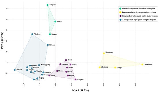 Resource-dependent, coal-driven regions (Inner Mongolia, Shaanxi, and Shanxi): This cluster exhibited the highest mean CH4 emissions (0.68 Mt), reflecting its heavy reliance on coal and fossil energy. These regions led in raw coal and natural gas production, with high energy consumption and crude oil outputs. Simultaneously, non-energy factors, such as rice planting area and municipal waste disposal, remained low.