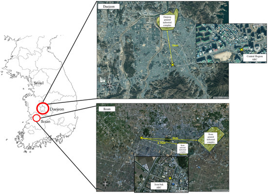 Field observations were conducted at air quality research center (ARC) located in Daejeon Metropolitan City and Iksan City, Jeollabuk-do, operated by the National Institute of Environmental Research (NIER) (Figure 1). The site in Daejeon, officially named the Central Region ARC, is situated at 36.3224895° N and 127.4138165° E. It serves as a key facility for detailed air quality analysis in the central region of Korea. Approximately 5 km to the north lies the Daejeon General Industrial Complex, which may influence the site’s pollutant profile. The monitoring site in Iksan, known as the Jeonbuk Regional ARC, is located in Mohyeon-dong with the same geographic coordinates (35.9555494° N, 126.9391455° E). This station is surrounded by extensive agricultural land, distinguishing it from typical urban monitoring environments. The region is also influenced by nearby livestock facilities, such as pig and poultry farms, which are expected to contribute significantly to atmospheric ammonia levels. Although the site is classified as suburban, there are industrial complexes located 3.7 km and 5 km to the east, which may further affect local air quality.