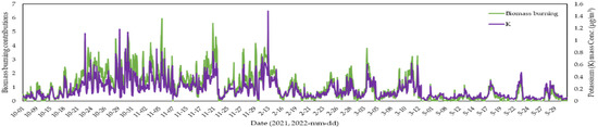 In Daejeon, secondary aerosols were the dominant contributors to PM2.5, with secondary sulfate and nitrate (including chloride) accounting for 6.3 µg/m3 (30.1%) and 4.8 µg/m3 (22.0%), respectively. These contributions are notably higher than previously reported values (~19%), suggesting a rising influence of secondary aerosol formation in recent years [50]. In Iksan, both secondary sulfate and nitrate contributed 17.3% each. The high nitrate contribution in Iksan is likely driven by elevated ambient levels of NH3 and HNO3 [17], along with influences from long-range transport (Table S6). Traffic emissions (16.9%) and soil/dust (15.9%) were more significant in Daejeon compared to Iksan (both at 14.5%), likely due to higher traffic density. Contributions from industrial sources, coal combustion, and sea salt were comparable between the two sites. Figure 3 presents the time series of potassium ion concentrations and biomass burning source contributions. In Iksan, biomass burning contributions peaked during the fall, which can be attributed to post-harvest agricultural residue burning [19].